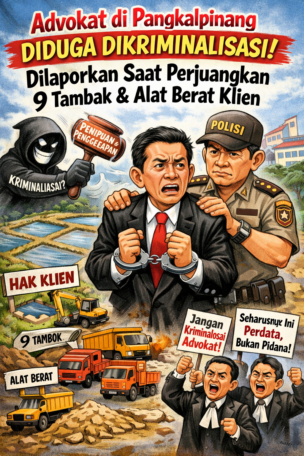 PANGKALPINANG, Faktababelnews.id — Ironi penegakan hukum kembali jadi sorotan di Pangkalpinang. Seorang advokat, Andi Kusuma, yang sedang memperjuangkan hak kliennya atas sembilan unit tambak, sejumlah alat berat, dan tiga dump truk, justru berujung dilaporkan ke polisi.